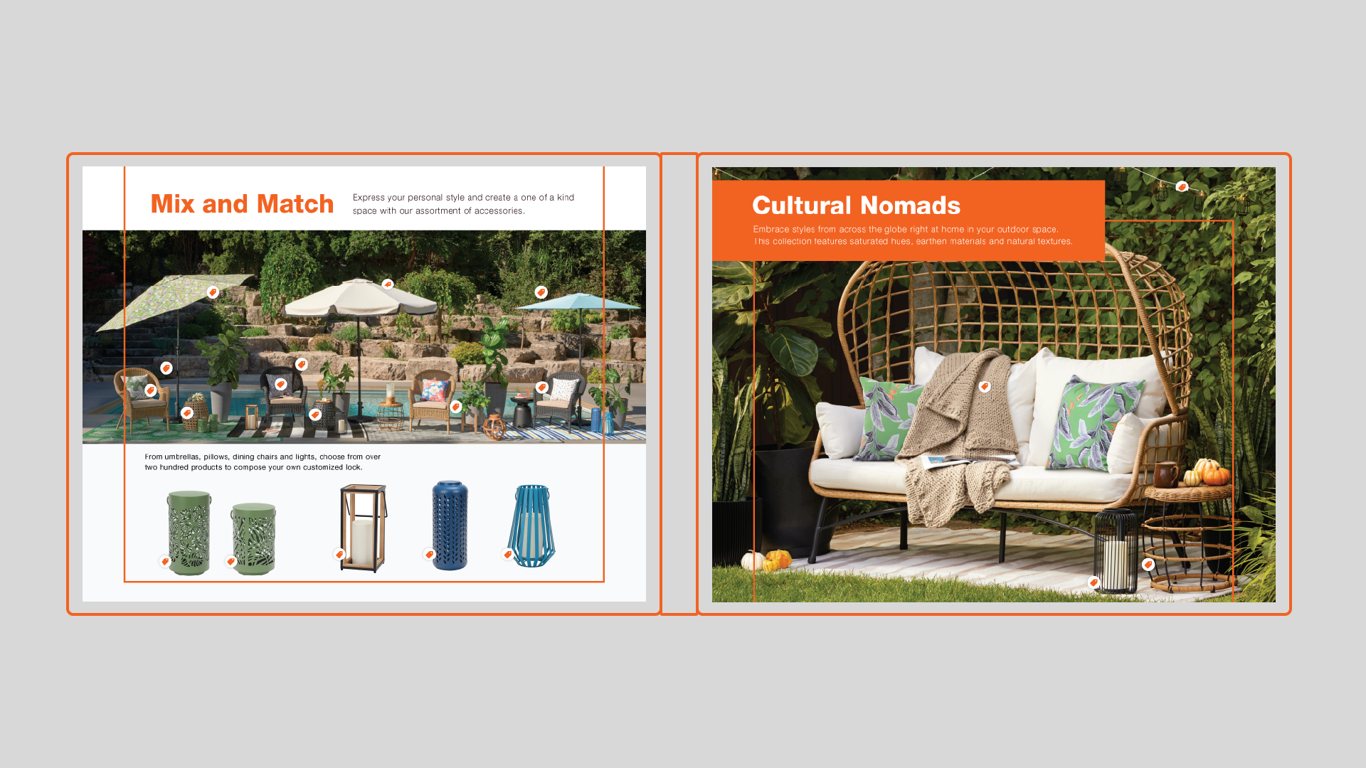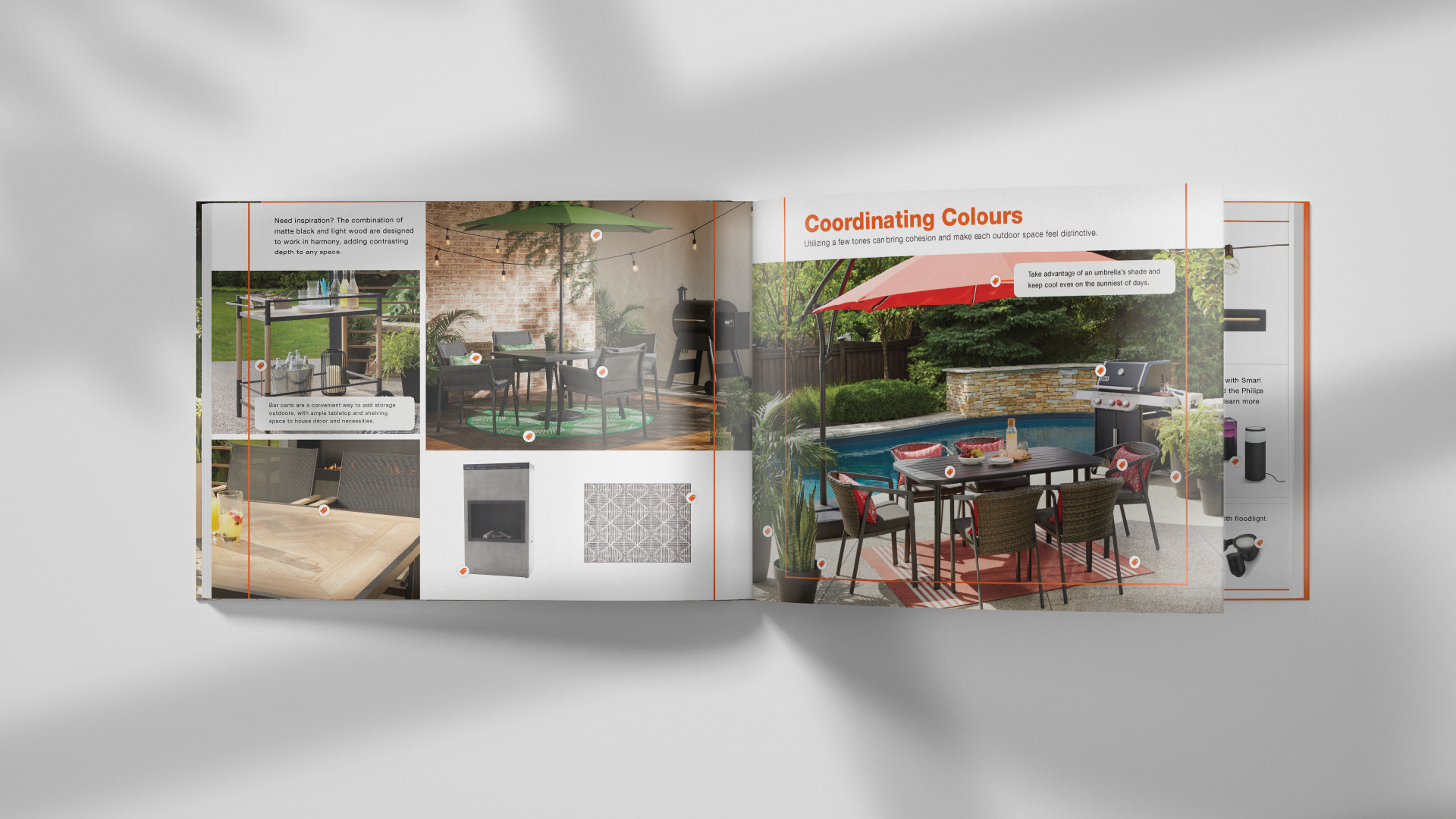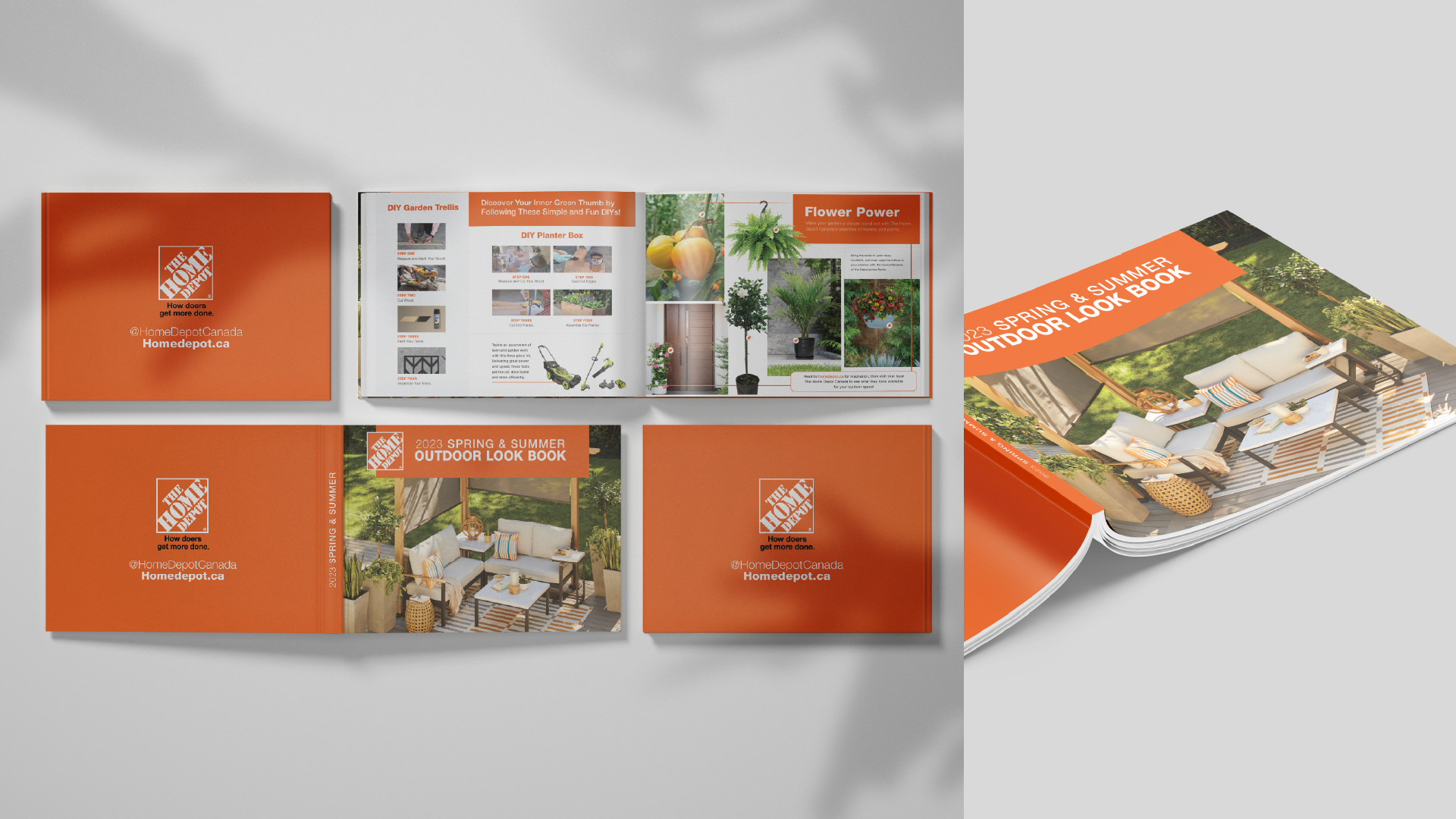 This ultimate guide is presented in an editorial format using Home Depot colours of orange and white, creating a warm, welcoming atmosphere that keeps the focus on the vibrant imagery. The dynamic layouts and photographs adopt an elevated editorial style, rendering a visually interesting guide for the sunny season.